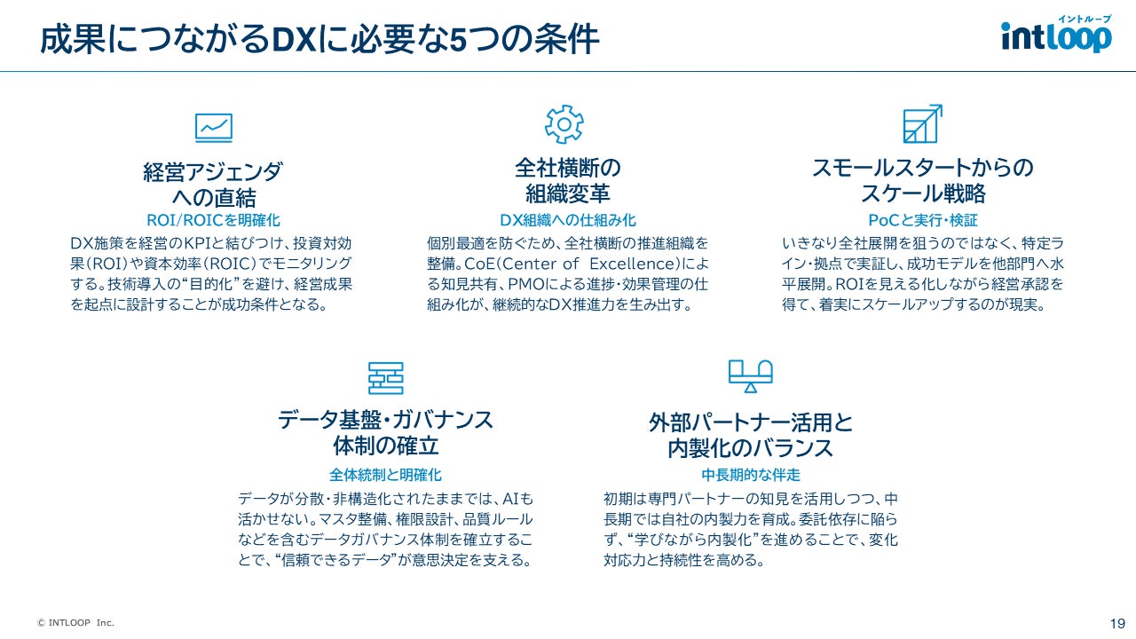 岡村は、PoC(概念実証)止まりや部分最適に陥らず、DXを成果へ導くための要諦として以下の5項目を提示しました。