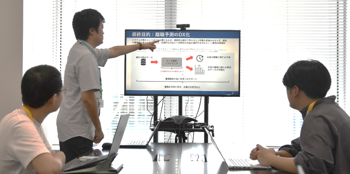 今回のインターンシップは、学生たちにとって実戦的なスキル習得につながるプログラムを5日間にわたって行われました。具体的には、当社の自社開発製品であるクラウド型勤怠管理システム「CC-BizMate」(https://cc-bizmate.jp/)に蓄積している勤怠データを分析し、有益な情報の抽出から付加価値を高めるための新機能の提案までを行うという内容です。
