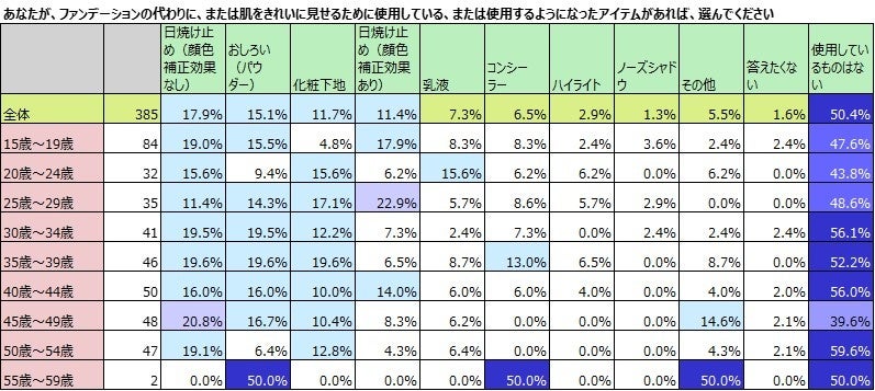 ファンデーションを使用する代わりに使用しているアイテムは多品目にわたり、最も多く使用されているのは、「日焼け止め(顔色補正効果なし)」で、17.9%。「おしろい(パウダー)」で15.1%、「化粧下地」11.7%と続きます。「日焼け止め(顔色補正効果あり)」を選んだ女性は11.4%で、顔色補正効果なし、ありの日焼け止めを合わせると約3割の女性が、ファンデーションを使用する代わりに日焼け止めを使用しており、「日焼け止め」は広く女性に必要性を感じられているようです。