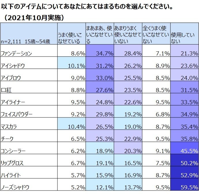 1. ファンデーションを使用していない女性、11.5%から21.3%に倍増。