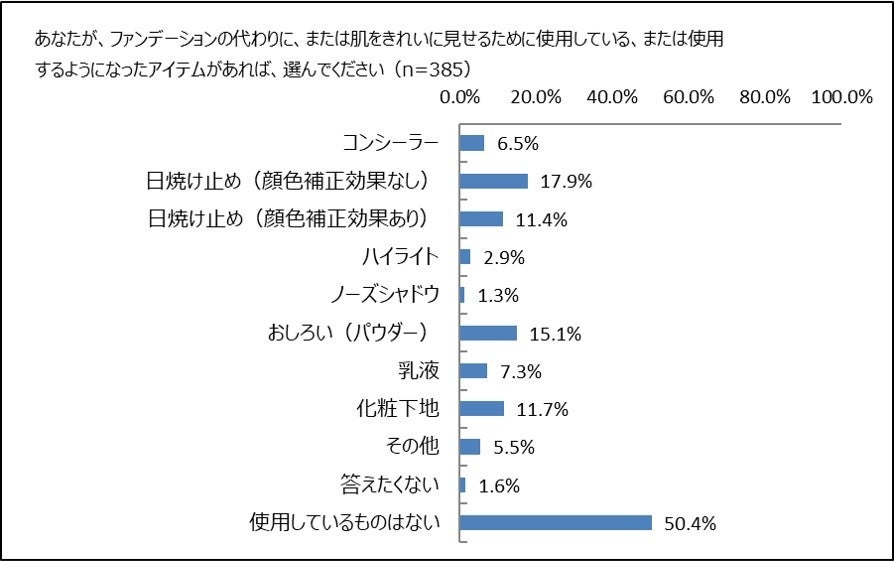ファンデーションを使用していないと答えた女性に、ファンデーションの代わりに肌をきれいに見せるために使用しているアイテムを聞きました。「使用しているものはない」と答えた女性が、50.4%であることから、約半数の女性は、何らかのアイテムを使用して、顔色をきれいにみせていることがわかりました。(複数回答につき、100%にはなりません。)