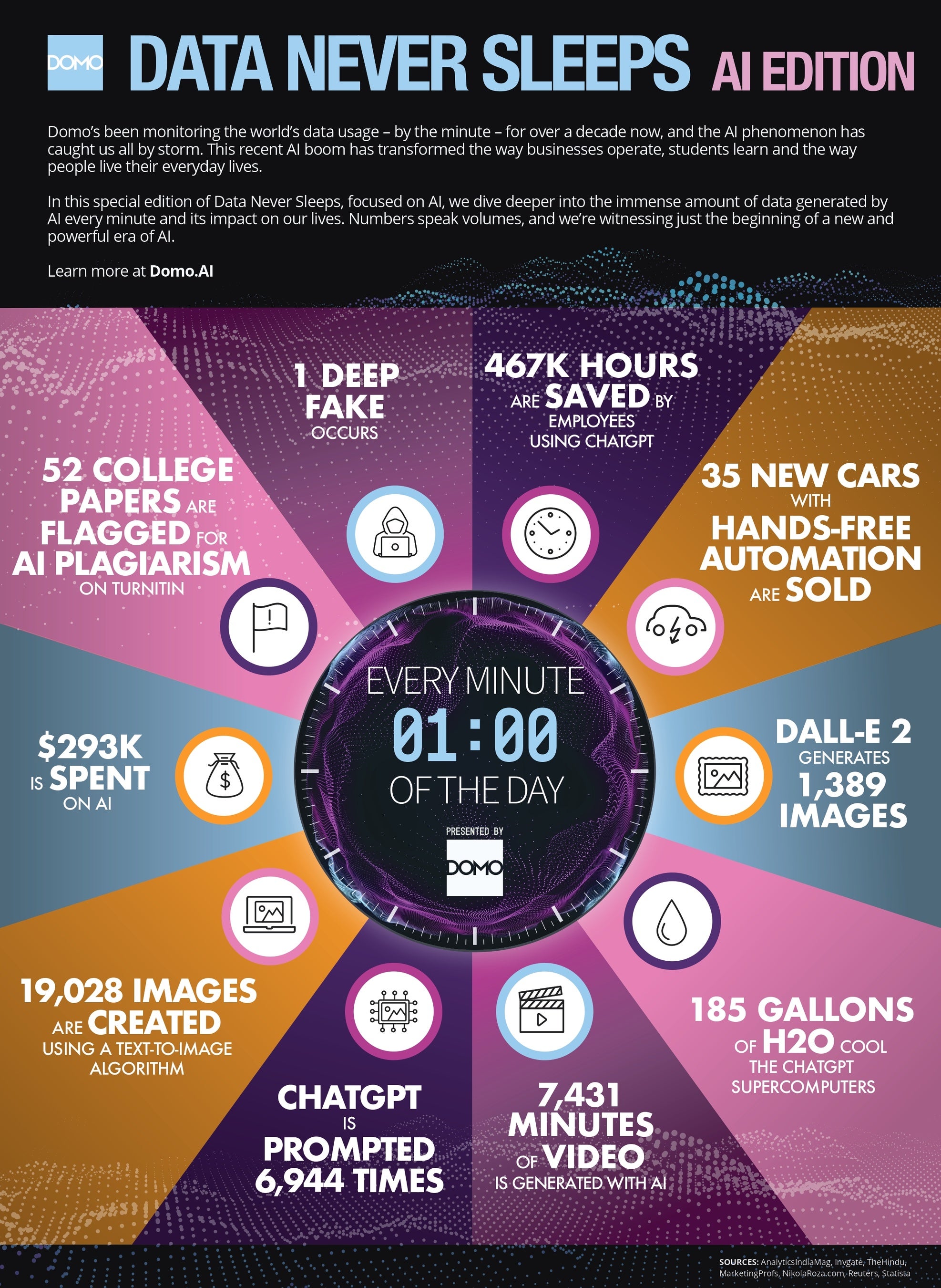 Domo(本社:米国ユタ州シリコンスロープス)は2024年7月23日(現地時間)、大好評の年次分析レポート「Data Never Sleeps(DNS)」の特別版として人工知能(AI)版を発表しました。このインフォグラフィックは、オンラインでの人々のやりとりによってインターネット上で毎分どれだけのデータが生成されているのかを視覚的に示しています。また、毎分生成される膨大な量のAIデータの利用状況と、AIが私たちの日常生活にもたらす影響について掘り下げています。
