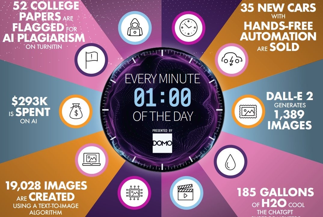 勢いを増す自動化の波:大規模言語モデル(LLM)は、会話はもちろん、企画の設計や自動車の運転などと、活用範囲が広がっています。言語入力から画像やイメージを作成するAIツール「DALL·E 2」は、毎分1,389枚の画像を生成し、他の同様のAIツールも毎分19,028枚の画像を生成しています。さらに、毎分7,431分の動画がAIで生成されています。そして、世界では毎分35台のハンズフリー自動運転搭載の新車が販売されています。