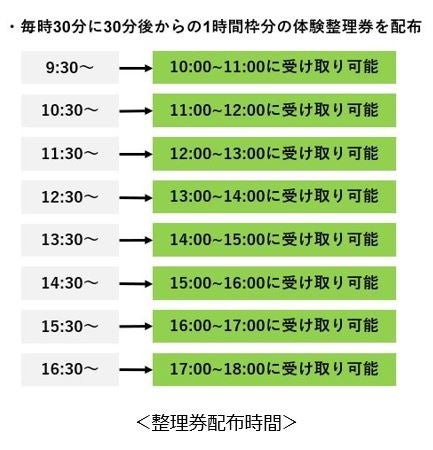9時から16時までの毎時30分に整理券を配布します。整理券に記載されている時間になったら、指定の待機列にお並びください。待機列にてお待ちいただく間に、アンケートの回答をお願いします。