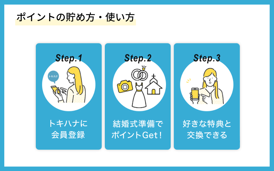 式場探しやドレス選びなど、トキハナを通じて結婚準備を進めることでポイントが貯まり、電子マネーやギフトなどに交換できるサービスです。