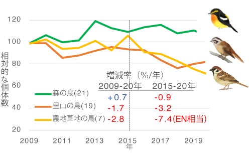 生息・生育環境別の解析では、農地や草原、湿地など開けた環境に生息・生育する種の減少傾向が目立ち、鳥類・チョウ類・植物の3分類群で共通していた。チョウ類や鳥類のほかに、良好な水辺環境の指標種(ホタル類、アカガエル類)や良好な草原環境の指標種(ノウサギ、カヤネズミ)の減少傾向も顕著であった。