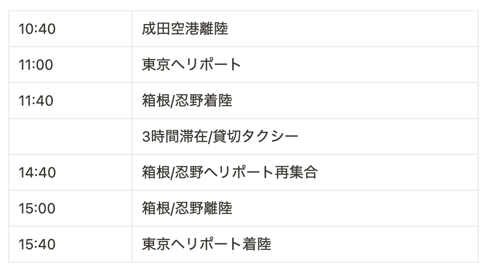 東京へリポート⇆成田国際空港 | 18分 | ¥180,000 |