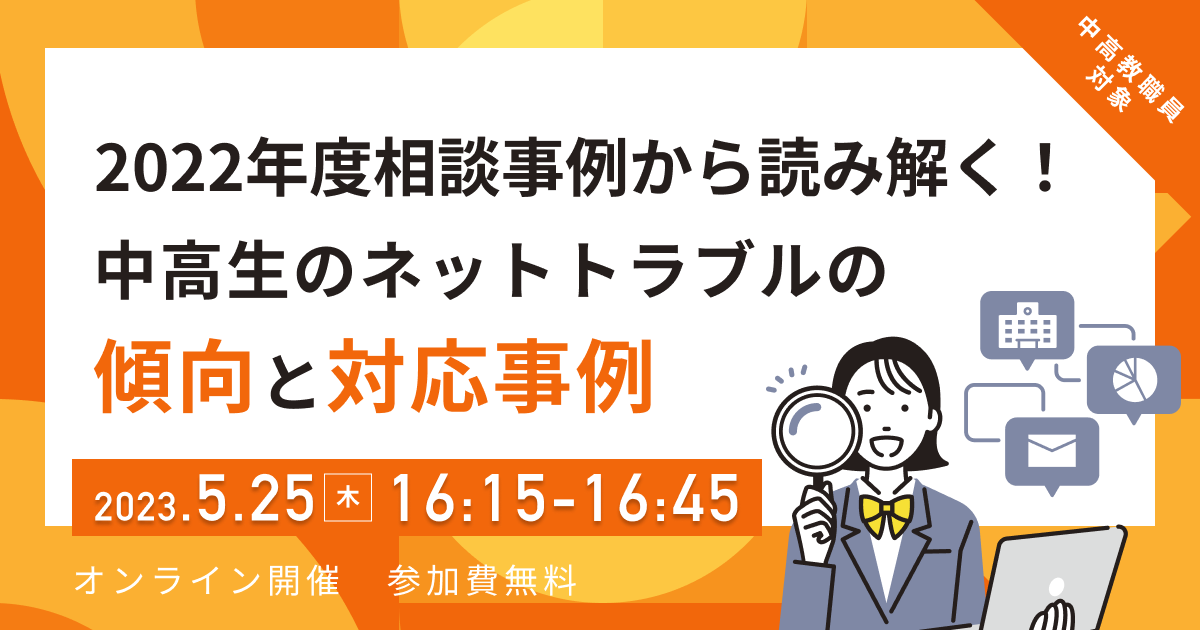 中高教職員向けオンライン研修会 「2022年度相談事例から読み解く!中高生のネットトラブルの傾向と対応事例」【2023年5月25日(木)無料開催】