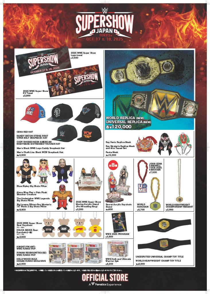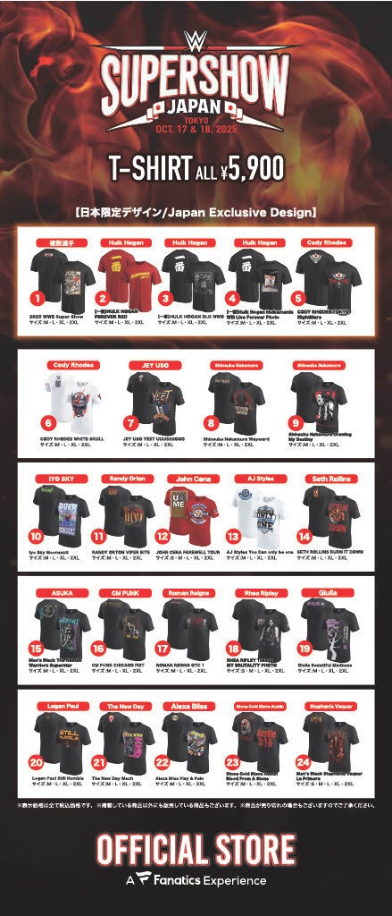 世界最大級のデジタルスポーツプラットフォームを運営するFanatics Inc.の日本法人、ファナティクス・ジャパン合同会社(東京都港区、マネジング・ディレクター:川名正憲、以下「ファナティクス・ジャパン」)は、2025年10月17日(金)、18日(土)に両国国技館にて開催される、『WWE SuperShow Japan』の期間中、会場でのオフィシャルグッズ販売を行います。取り扱い商品は、Tシャツ、タオルなどの応援グッズ、およびアクリルスタンドなどの雑貨類となります。