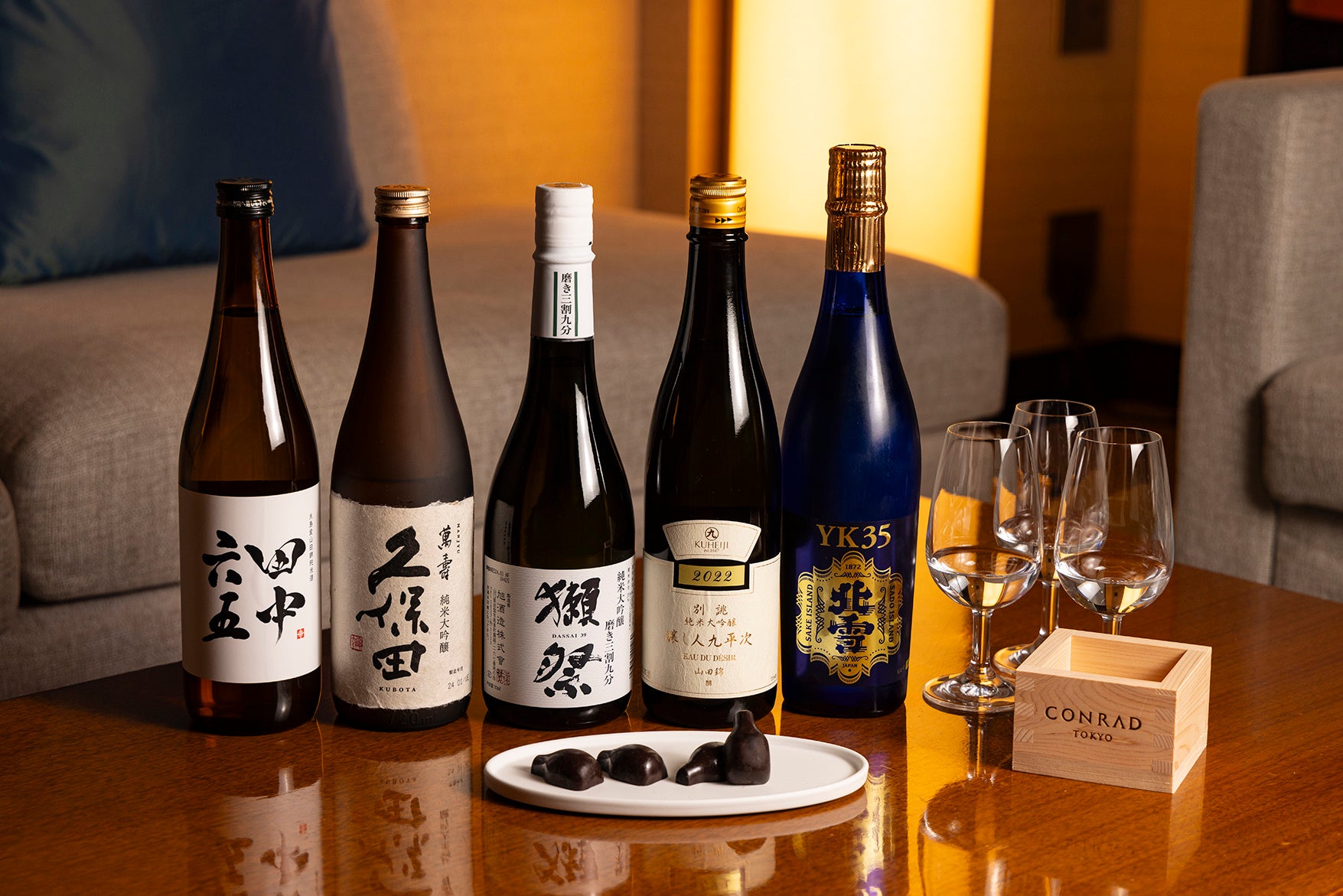 日本酒3種のテイスティングに特製チョコレート、コンラッド東京ロゴ入り升のプレゼント付き。この夏はお部屋でゆっくりと極上の日本酒体験を