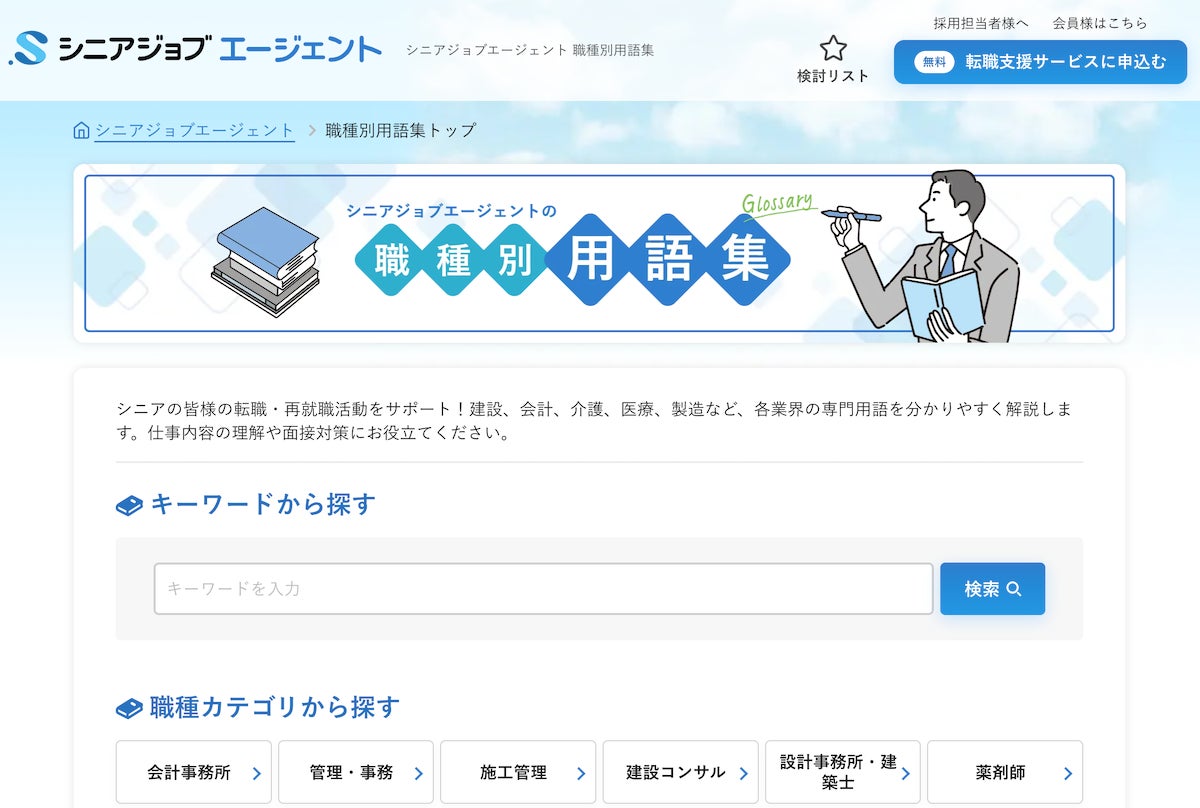 シニア転職支援の株式会社シニアジョブ(本社:東京都新宿区/代表取締役 中島康恵)は、2025年7月3日に、運営するシニア専門人材紹介・人材派遣「シニアジョブエージェント」において、取扱職種ごと専門用語などを解説した「職種別用語集」を新たに公開しました。
