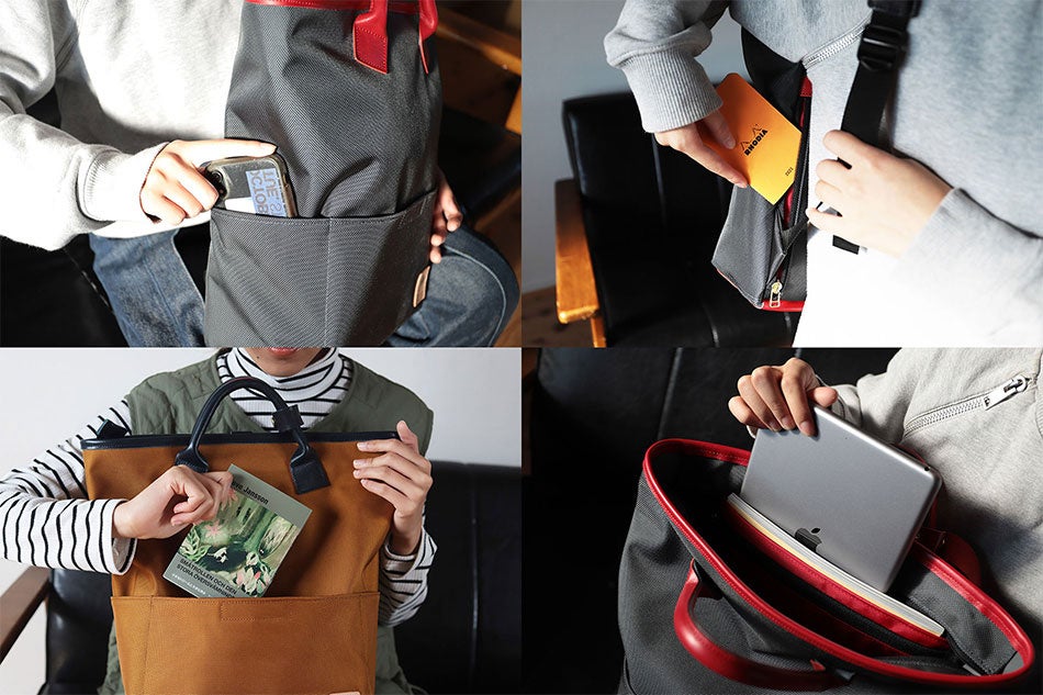 A4サイズの書類やタブレットの収納に便利なクッションポケットや、ドリンクや傘が収納できるサイドポケット付き。バックポケットには鍵・定期・スマホ・お財布などよく使う小物を入れておくと取り出しもスムーズです。
