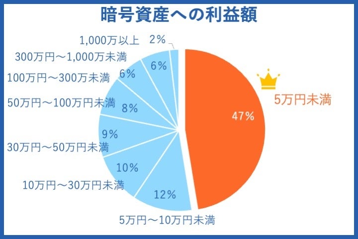 実際に暗号資産に投資して得た利益額は、5万円未満の人が47%と約半数であることがわかりました。背景として、少額から取引している人が多い点が挙げられます。