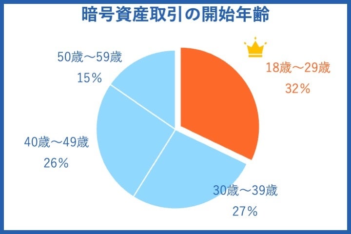 暗号資産の取引を始める年齢として、18歳〜29歳が32%と最も多い結果になりました。
