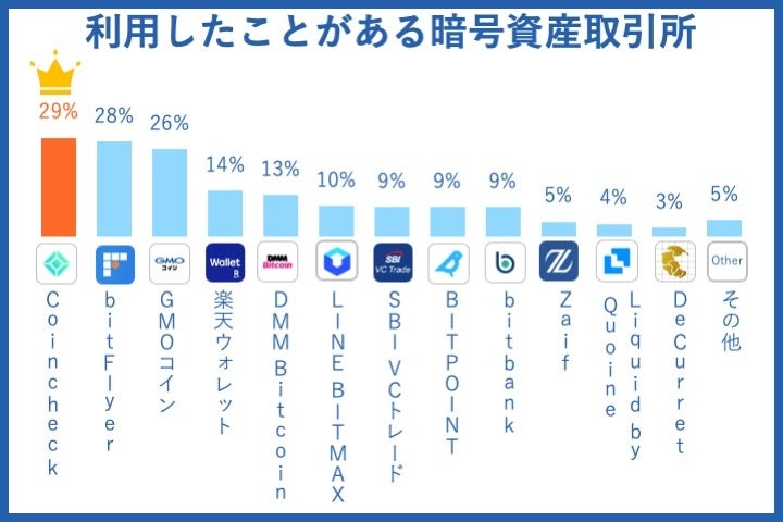 今まで利用したことのある暗号資産(仮想通貨)所は、一番目はCoincheck(29%)で、二番目がbitFlyer(28%)という結果になりました。