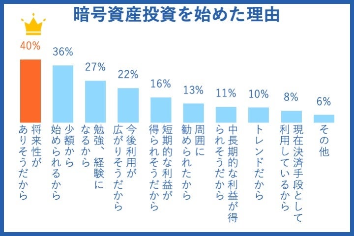 暗号資産の取引を始めようと思った理由として「将来性がありそうだから」と答えた方が、全体の40%という結果になりました。前回(2022年1月調査時点)と比較すると、将来性について期待する方の割合が増えています。