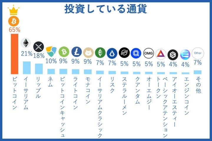 また、どの仮想通貨に投資をしているかについて、1番目は「ビットコイン」(65%)で、2番目が「イーサリアム」(21%)という結果になり、ビットコインは6割超の人が投資をしているメジャーな通貨であることがわかりました。