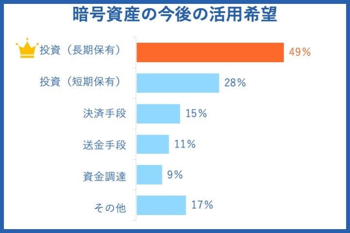 暗号資産の今後の活用方法について、一番目は長期保有の投資(49%)で、二番目が短期保有の投資(32.3%)という結果になりました。
