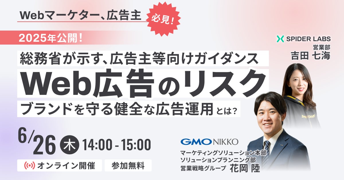 2025年6月26日(木)、株式会社Spider Labs(本社:東京都港区、代表取締役:大月 聡子)は、GMO NIKKO株式会社(本社:東京都渋谷区、代表取締役社長執行役員:佐久間 勇)と共催で、デジタル広告の運用に携わる方を対象とした無料オンラインウェビナー「広告主等向けガイダンスを読み解く 〜デジタル広告の健全な運用に向けて〜」を開催いたします。