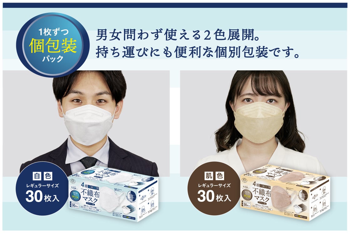 マスクは個別包装されているので、バッグやポーチなどに入れて衛生的に持ち運べ、いつでもどこでも感染対策にお役立ていただけます。また、色は性別を選ばない白色と肌色(ベージュ)の2色をご用意。社内使用から接客業・営業まで、幅広いシーンでお使いいただけます。