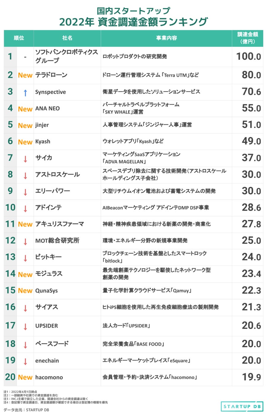 2022年1-3月の国内スタートアップ資金調達金額ランキングは、先月に引き続きソフトバンクロボティクスグループがトップにランクインしました。また、2位のテラドローンをはじめ、ANA NEO、jinjer、Kyash、アキュリスファーマ、モジュラス、QunaSys、hacomonoの計8社が新規ランクイン。
