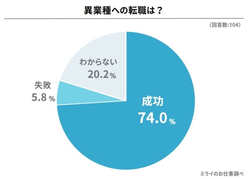 今回アンケートにお答えいただいた異業種への転職をした104人のうちなんと74.0%が、転職が「成功」だったと回答しました。多くの人が、異業種への転職に満足していることがわかります。