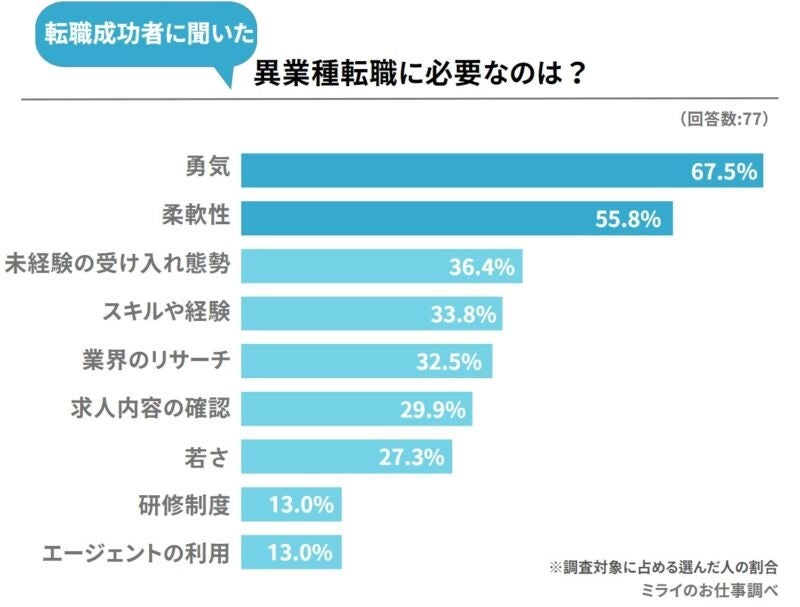 最後に、異業種転職に成功した77人に「成功に必要な要素」を聞いてみました。その結果、「勇気」がもっとも多く67.5%、「柔軟性」が第2位で55.8%となりました。異業種で働くためのスキルや経験、業界・求人の事前リサーチ、転職先の環境よりも、マインドが大事と回答した人が多い結果となりました。