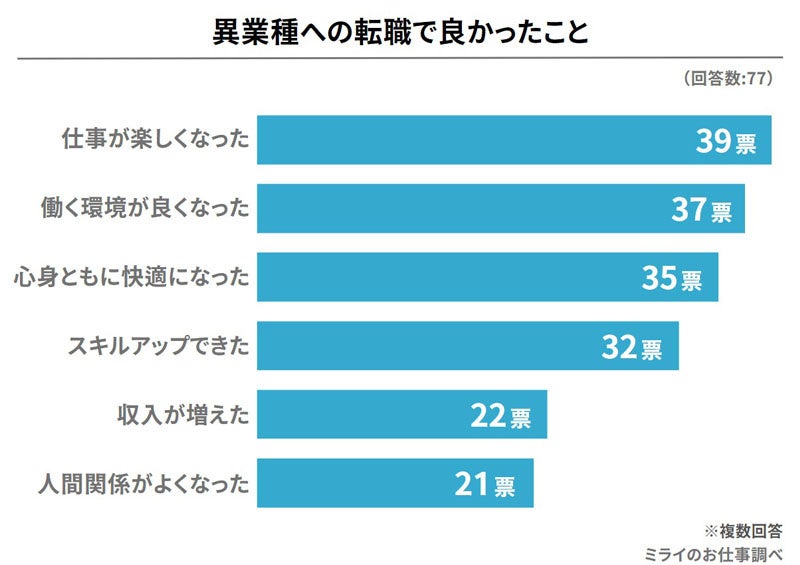 異業種への転職を「成功」と感じている人に、転職して良かったと思う理由を答えてもらいました。もっとも多い理由は「仕事が楽しくなった・内容に満足している」で39票、次いで「労働環境がよくなった」が37票、「心身ともに快適になった」が35票となりました。