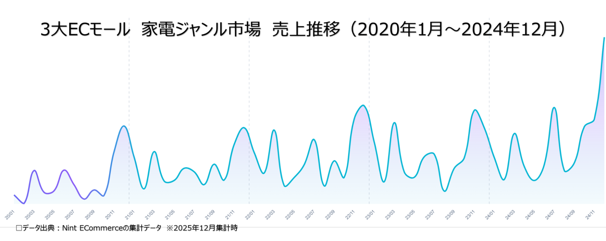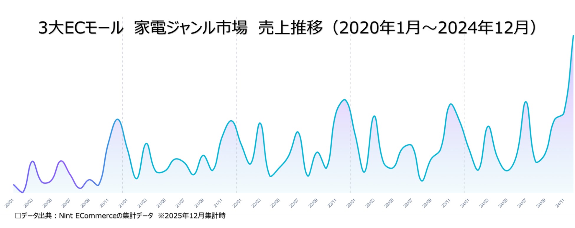 国内3大ECモール(楽天市場・Amazon・Yahoo!ショッピング)の公開データを収集・分析するクラウドサービス「Nint ECommerce」を提供している株式会社Nint(本社:東京都新宿区、代表取締役:吉野順子、以下「Nint」)は、3大ECモールにおける家電ジャンルの市場規模、売上推移、季節性について調査・分析を行いました。