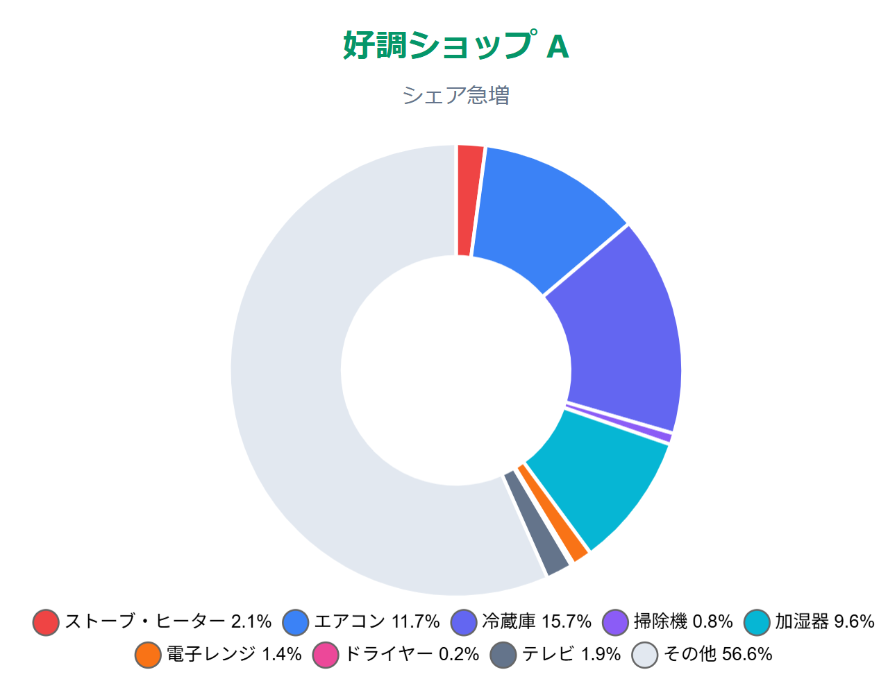 好調のAショップは、冷蔵庫(15.7%)やエアコン(11.7%)といった日用的な家電で売上を構成しています。加えて、12月に需要が高まる加湿器も9.6%としっかり押さえており、季節需要を取り込めていることがわかります。