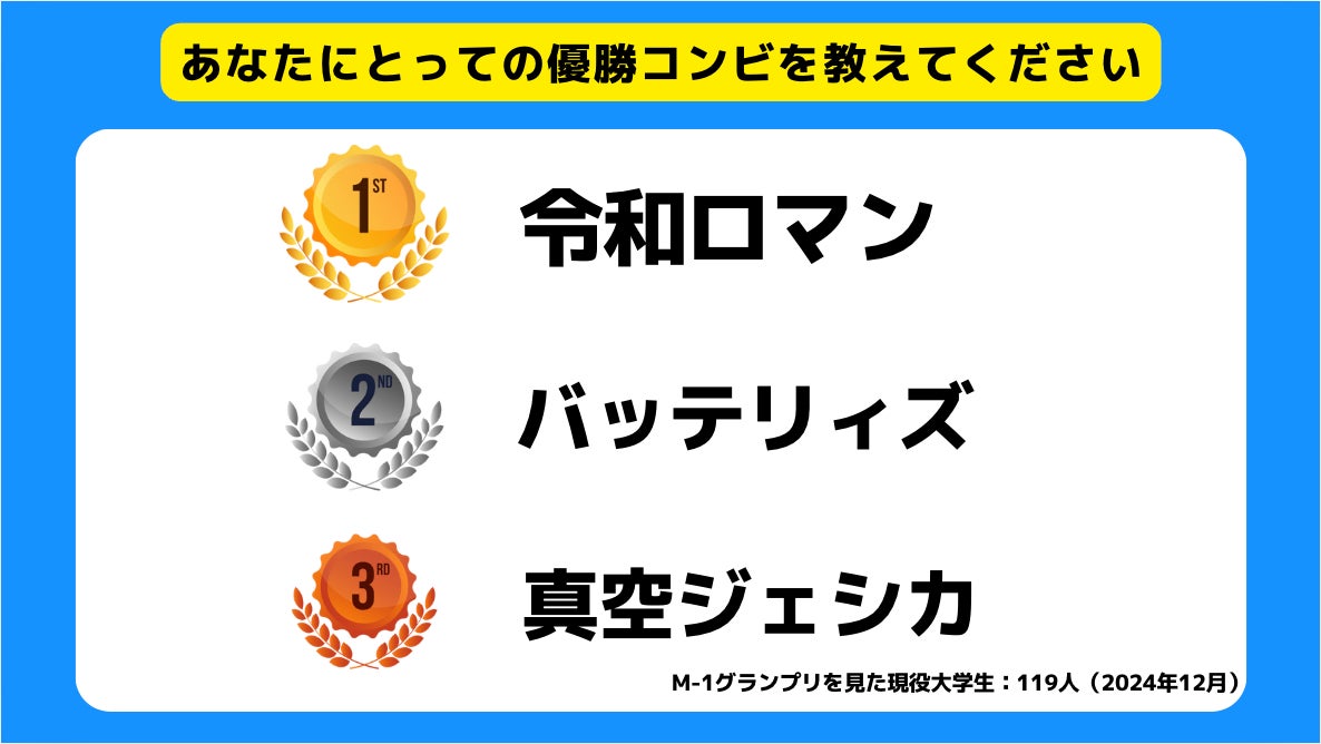 「自分にとっての優勝は?」でも令和ロマンが1位。2位はバッテリィズ。3位は真空ジェシカの結果に。