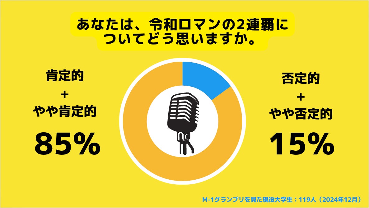 続いて、「令和ロマンの2連覇についてどう思うか」質問したところ、85%が「肯定的」だと回答しました。