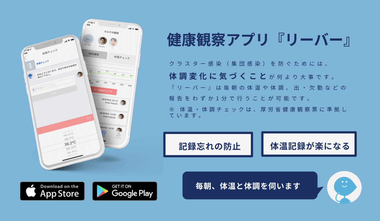 新型コロナウイルス感染症拡大防止のため、体調の変化を素早く認識して無理な出勤・通学・外出を控え、一人一人が 他者への感染リスクを自覚するだけでなく、組織として検査を積極的に勧奨するなど、感染拡大防止に対する意識を持つ ことが重要とし、健康観察アプリ活用を政府の基本的対処方針にも位置づけられました。(*1) リーバーは、学校現場の体温・体調チェックを1名11円/月と手頃なコストで生徒の健康管理に貢献し、教職員の集計の 手間を省くことが可能なプラットフォーム「健康観察アプリ」を提供していたことから、内閣官房が推奨する「健康観察アプリ」への申請を行いました。2021年11月、政府が推奨する「健康観察アプリ」の選定基準に達し、有識者委員会の調査を経て正式に認定されました。