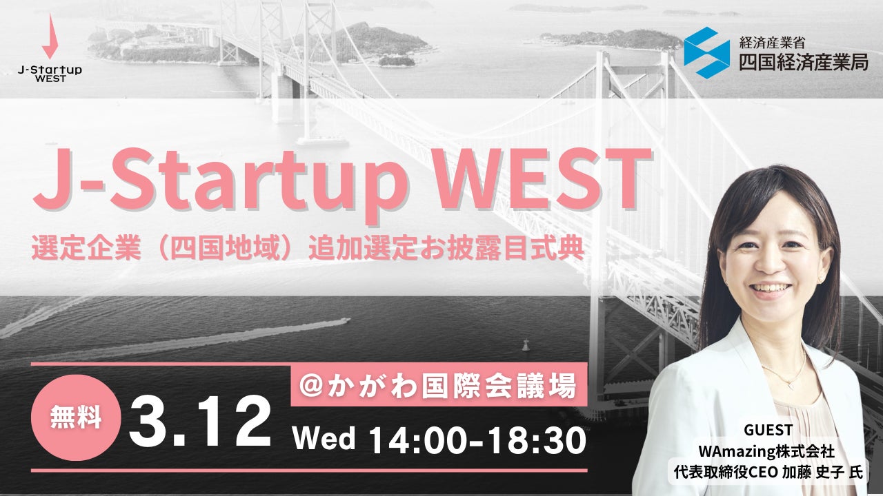 本イベントでは、共創プログラム参加企業による成果の報告のほか、J-Startup WEST(四国地域)の追加選定企業によるピッチや、WAmazing株式会社代表取締役CEO加藤氏による事業会社との共創を通じたスタートアップ企業の成長に関する基調講演を行います。