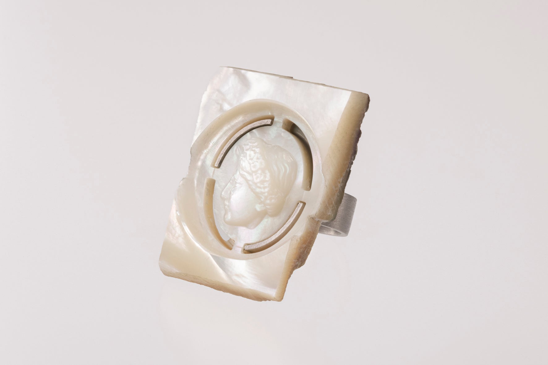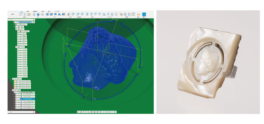 その結果、高精度な加工機を駆使して、母貝を用いたカメオの制作に成功しました。母貝一つひとつを丁寧に調整し、手作業ではなく機械で加工を行うことで、精密かつ繊細なアート作品を生み出しました。