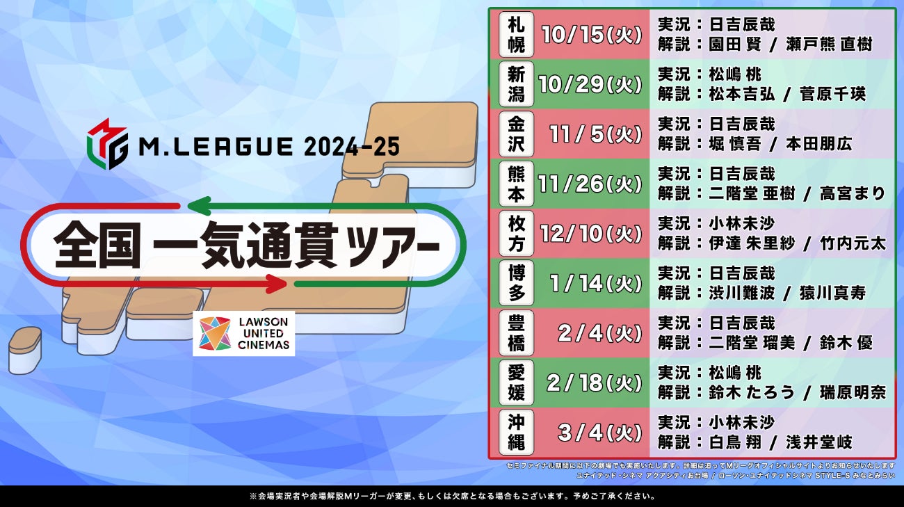 一般社団法人Mリーグ機構(本社:東京都港区、代表理事:藤田晋)は、株式会社ローソン・ユナイテッドシネマ(本社:東京都品川区、代表取締役社長:清水俊英)が運営する全国の複合型映画館「ユナイテッド・シネマ」にて、「Mリーグ2024-25 全国一気通貫ツアー」を今年度も引き続き開催することをお知らせいたします。