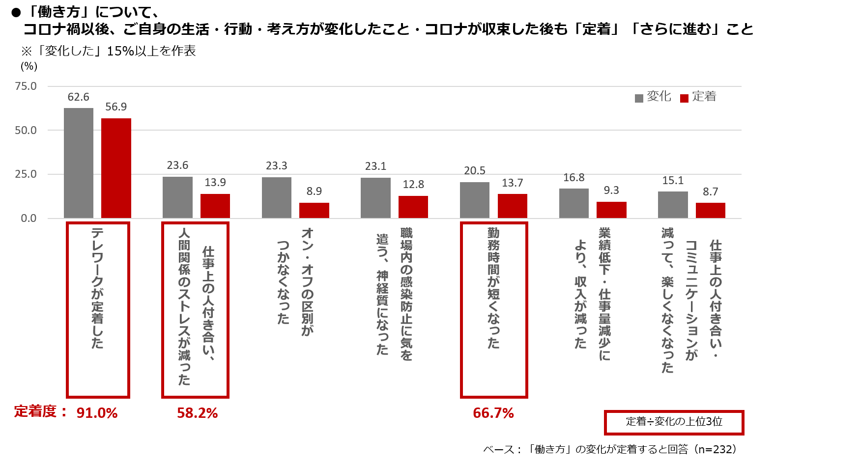 さらに、「働き方」に絞って見てみましょう。変化のトップは「テレワーク」(62.6%)で、このうち9割もの人がコロナ後も「定着する」と考えていることがわかりました。これに次いで、「変化した」という人の割合と、コロナ後も「定着する」回答率ともに高かったのは、「人間関係のストレス減」「勤務時間の短縮」でした。