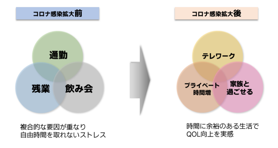 千葉県で奥さま・猫と暮らす20代のAさん。コロナ以前は、毎日往復2時間を通勤に費やし、残業もある中で自分が自由に使える時間の確保が難しかったと言います。しかし、コロナ禍でテレワークに移行。また、会社の飲み会やジム通いなど、それまで必要だと思っていたりメリットを感じていたりしたことについても、実は「惰性」「義務感」で行っていたと気づきました。通勤時間や「惰性」「義務」に費やす時間がなくなることで、「純粋に自分が楽しいと思えることに費やせる時間」が増え、以前には感じていなかった「QOL(クオリティオブライフ)」の向上を実感しているとのことでした(図表3)。