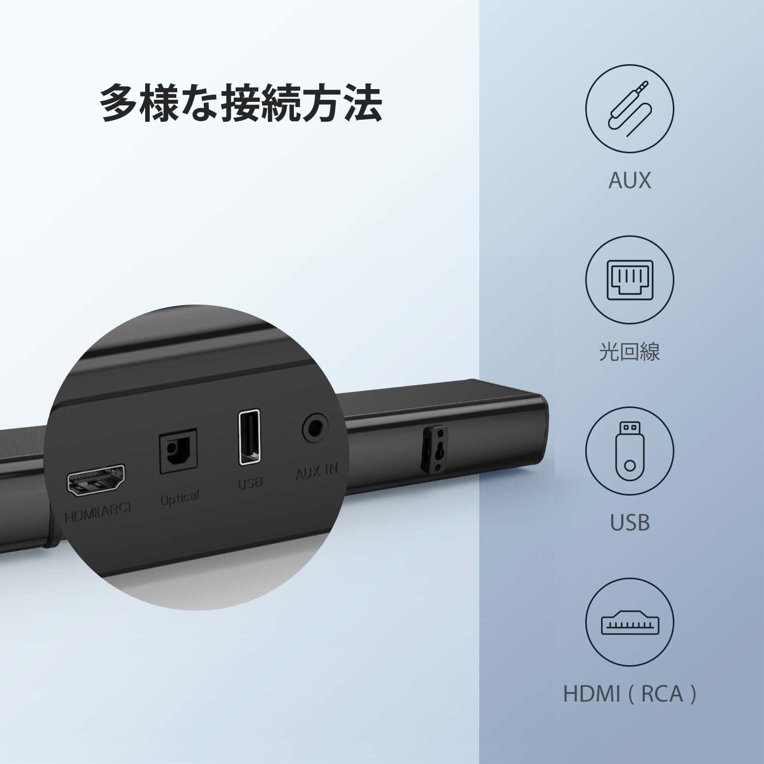 Bluetooth 5.0対応で、最大10m離れたデバイスに無線接続することができます。さらに、光回線端子/ HDMI(ARC)/AUX/ USBの入力端子を搭載しているため、テレビはもちろん、スマホやパソコン、タブレットなど、多種多様なデバイスに接続が可能です。