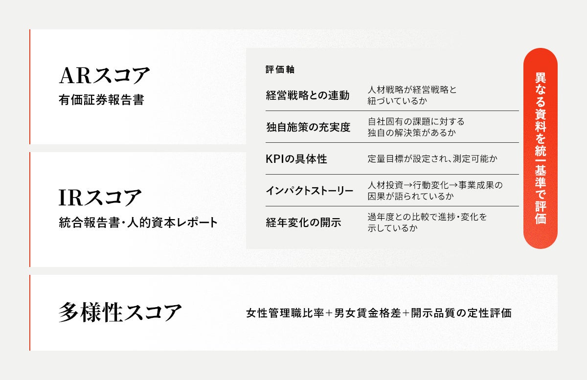 この統一基準に基づき、「ARスコア」「IRスコア」としてそれぞれの開示品質を精緻にスコアリング。さらに多様性に関する開示を評価する「多様性スコア」を加えた3つのスコアを統合的に算出することで、分散していた情報を集約しました。