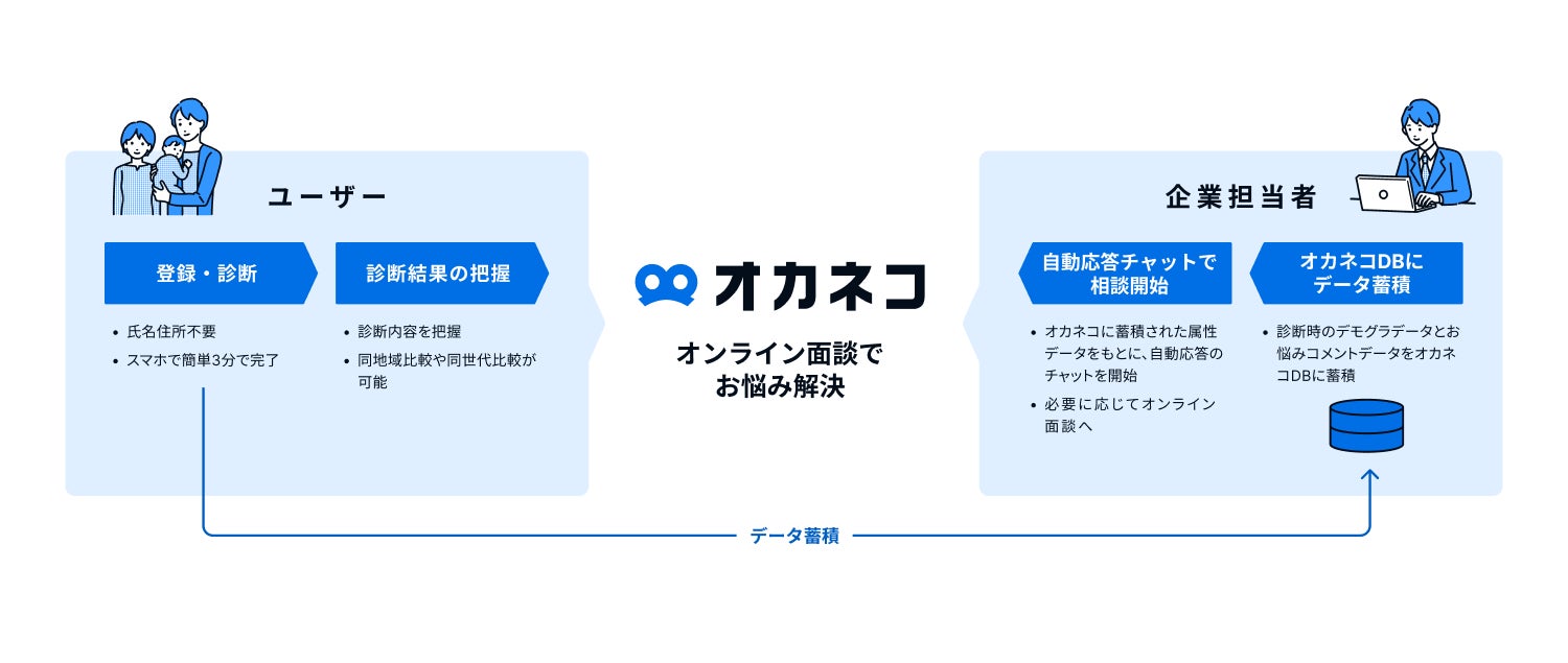 「オカネコ」で培ったノウハウやデータ基盤を活かした、to Bサービス「オカネコDX」は、企業へ上流となるデジタル営業戦略の策定から、チャットシステム・データ分析・金融コンテンツ等の実行支援を提供しており、企業は電話や対面での接点を持ちづらい層へも、アプローチ手段を持つことが可能となります。さらに、企業は家計・家族・お悩みデータをもとに、オカネコDXによる分析、改善提案から、ユーザーに合わせた営業活動を行うことができます。