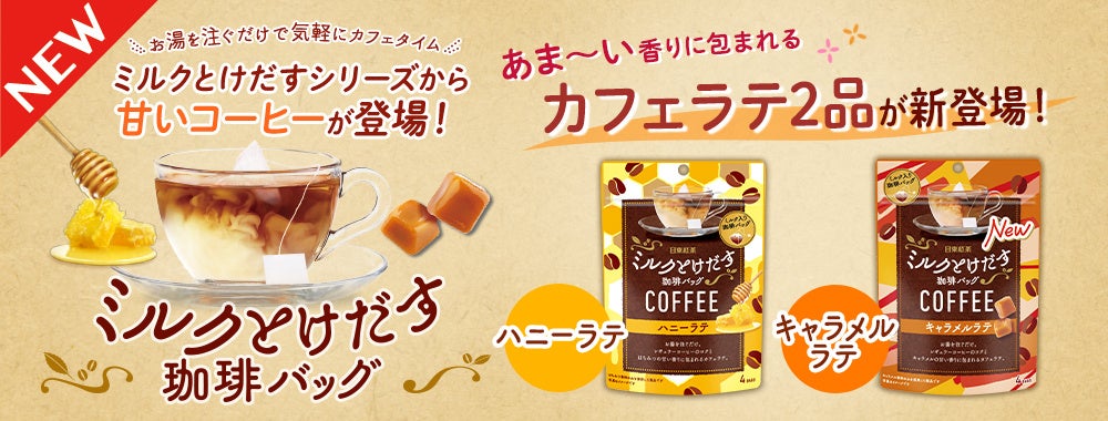 三井農林株式会社(所在地:東京都港区、代表取締役社長:佐伯 光則 以下、当社)は、2021年秋に発売して以来好評の、「ミルクとけだすティーバッグ」シリーズから、「日東紅茶 ミルクとけだす珈琲バッグ ハニーラテ4袋入り(以下、ハニーラテ)」「日東紅茶 ミルクとけだす珈琲バッグ キャラメルラテ4袋入り(以下、キャラメルラテ)」を2024年8月26日(月)より発売いたします。