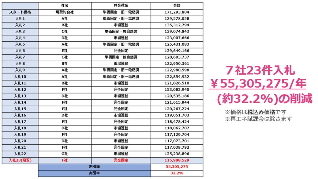 1社1入札が原則の通常の入札とは異なり、リバースオークションを活用することで小売電気事業者が複数回入札でき、より安価な再生可能エネルギープランの契約を引き出すことができました。