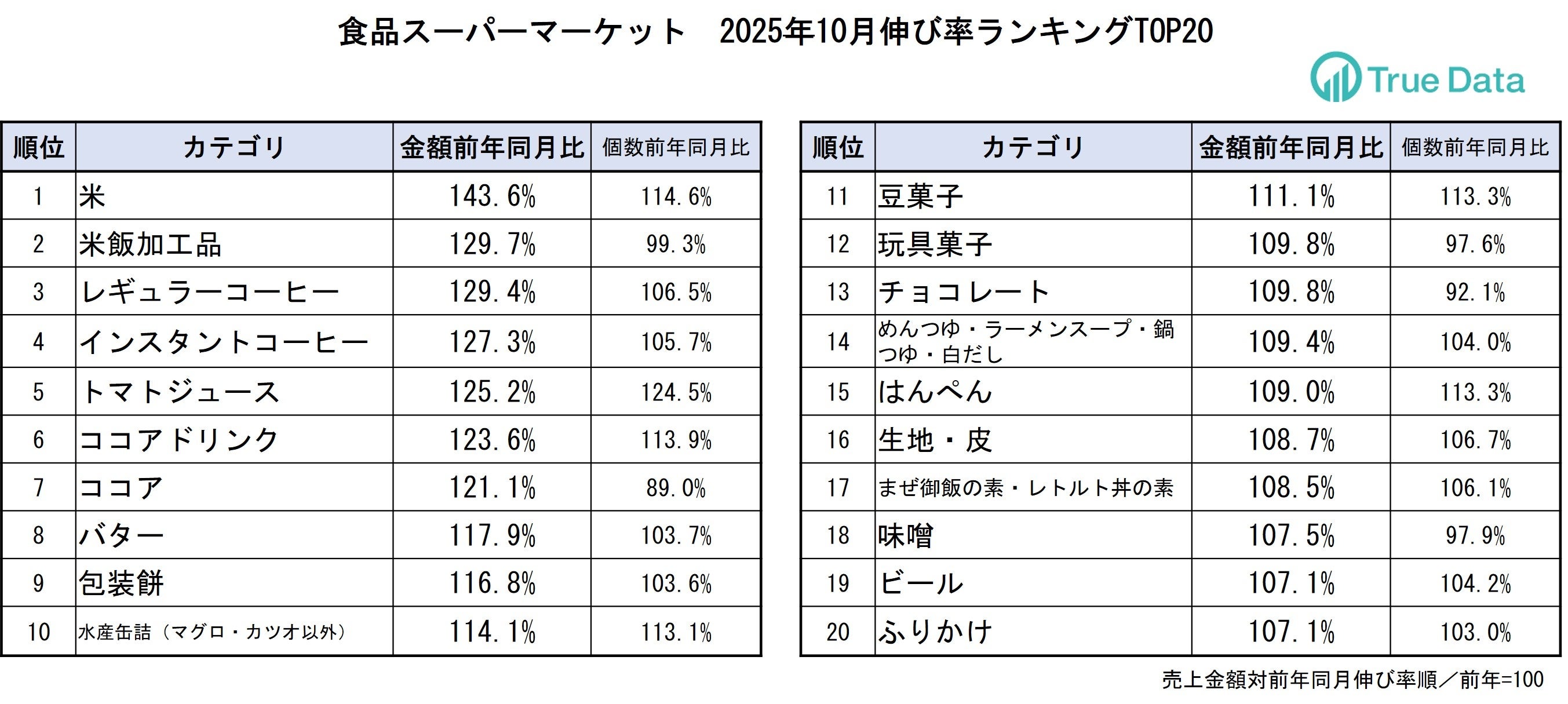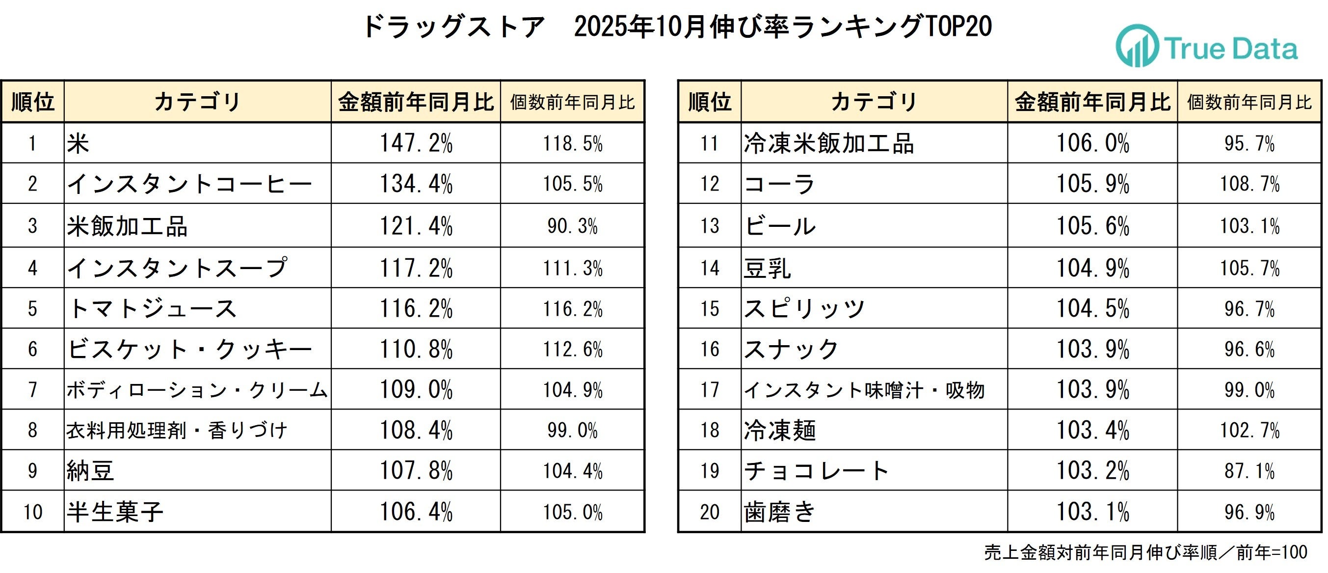 ビッグデータプラットフォームを運営する株式会社True Data(トゥルーデータ/本社:東京都港区、代表取締役社長:米倉 裕之、証券コード4416)は、当社の統計データをもとに、ドラッグストア、食品スーパーマーケットにおける2025年10月の売り上げ伸長カテゴリを発表します。
