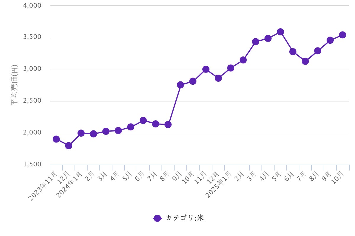 「米」の売り上げが前年同月に比べて大きく伸長しました。食品スーパーマーケットで「米」カテゴリ全体の平均売価は前年同月比で25.9%上昇しています。売上個数は前年10月に大きく減少していた影響で前年同月比が14.6%の増加となり、売上金額は同43.6%増加しました。ドラッグストアでは前年2024年10月はランキング圏外でしたが、当月は1位にランクインしました。