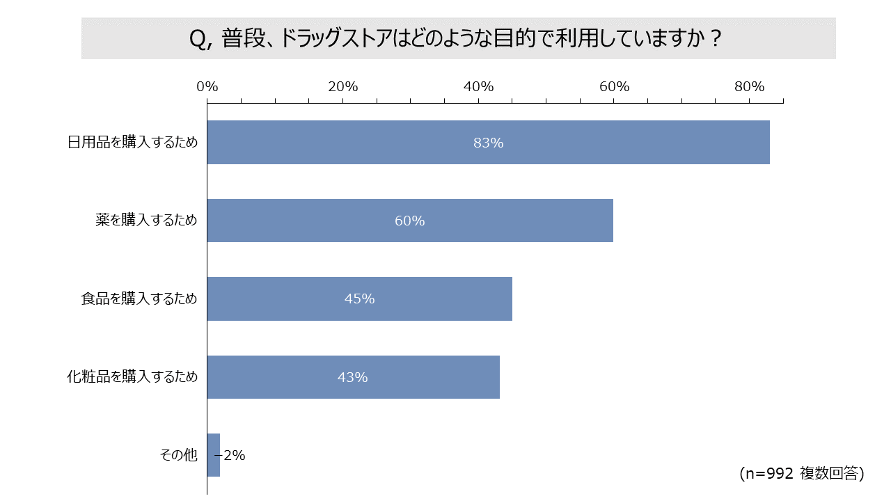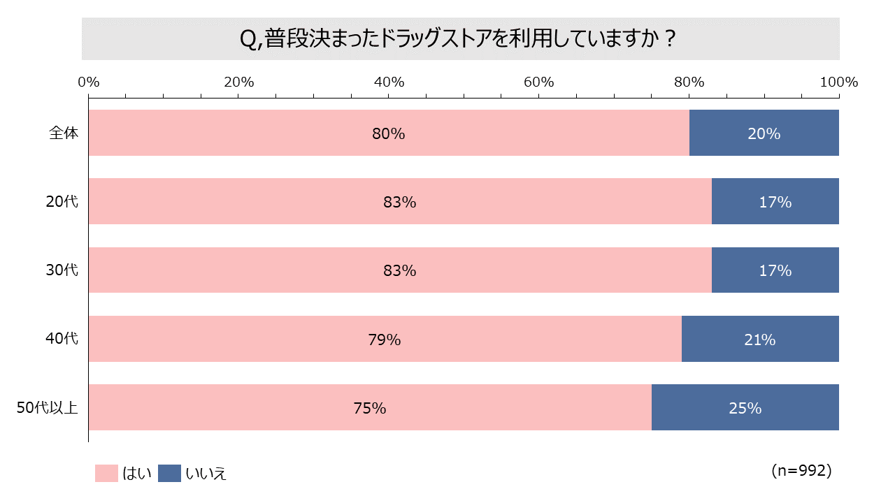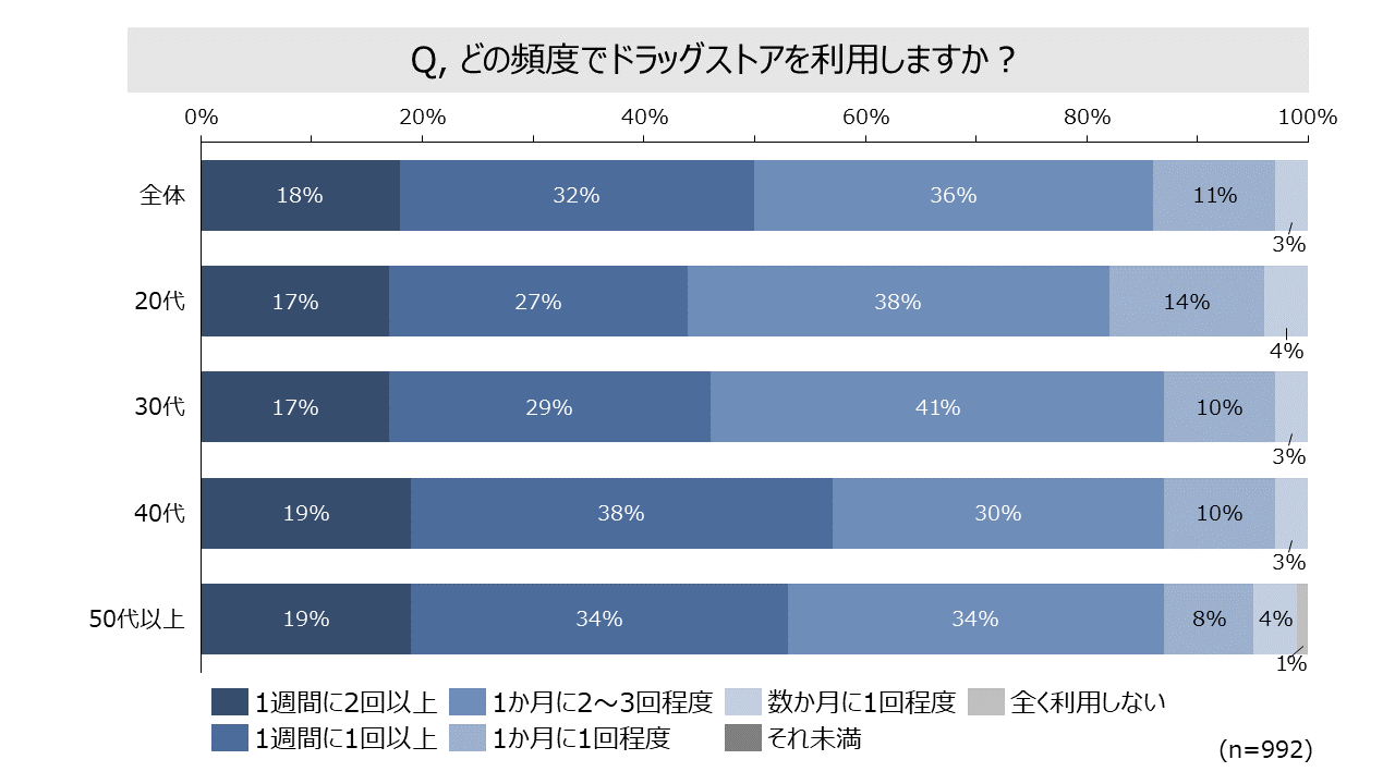 薬や化粧品から日用品までを手軽に購入することができるドラッグストア。実際に消費者たちはどのくらいの頻度で利用しているのかなど、ファンくる会員992名(男性:263名、女性:729名)に調査を実施しました。