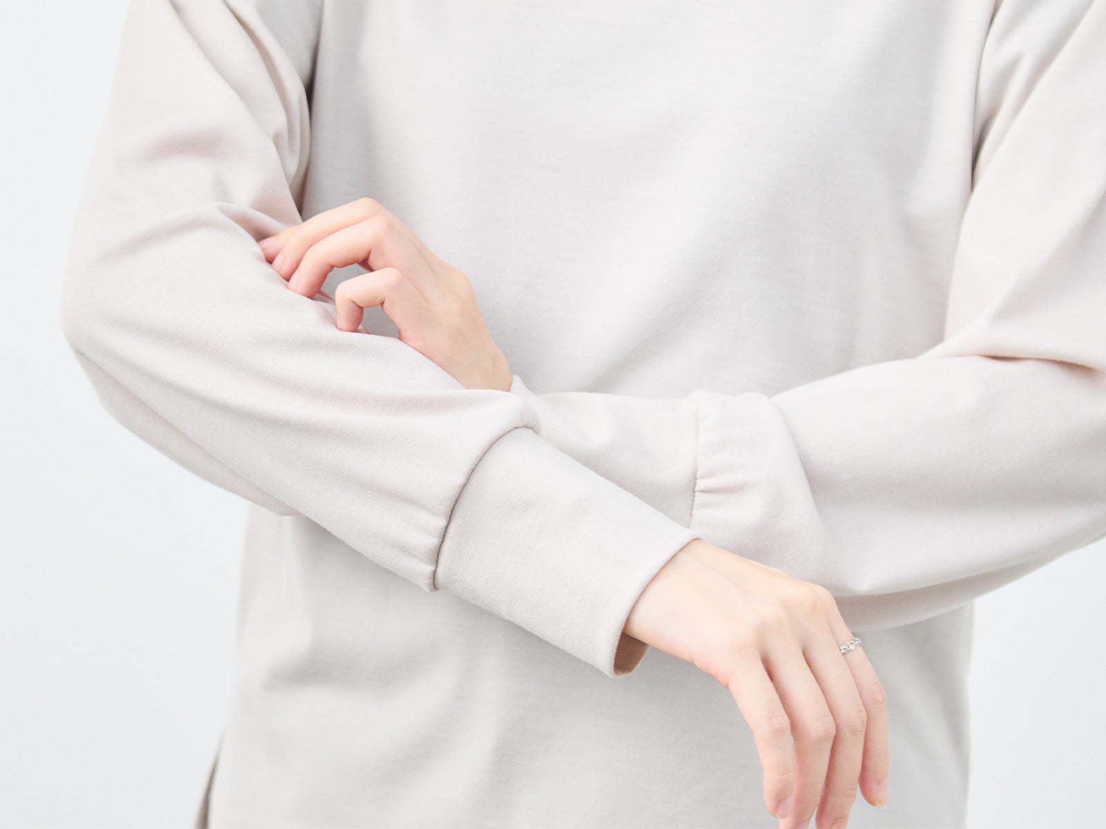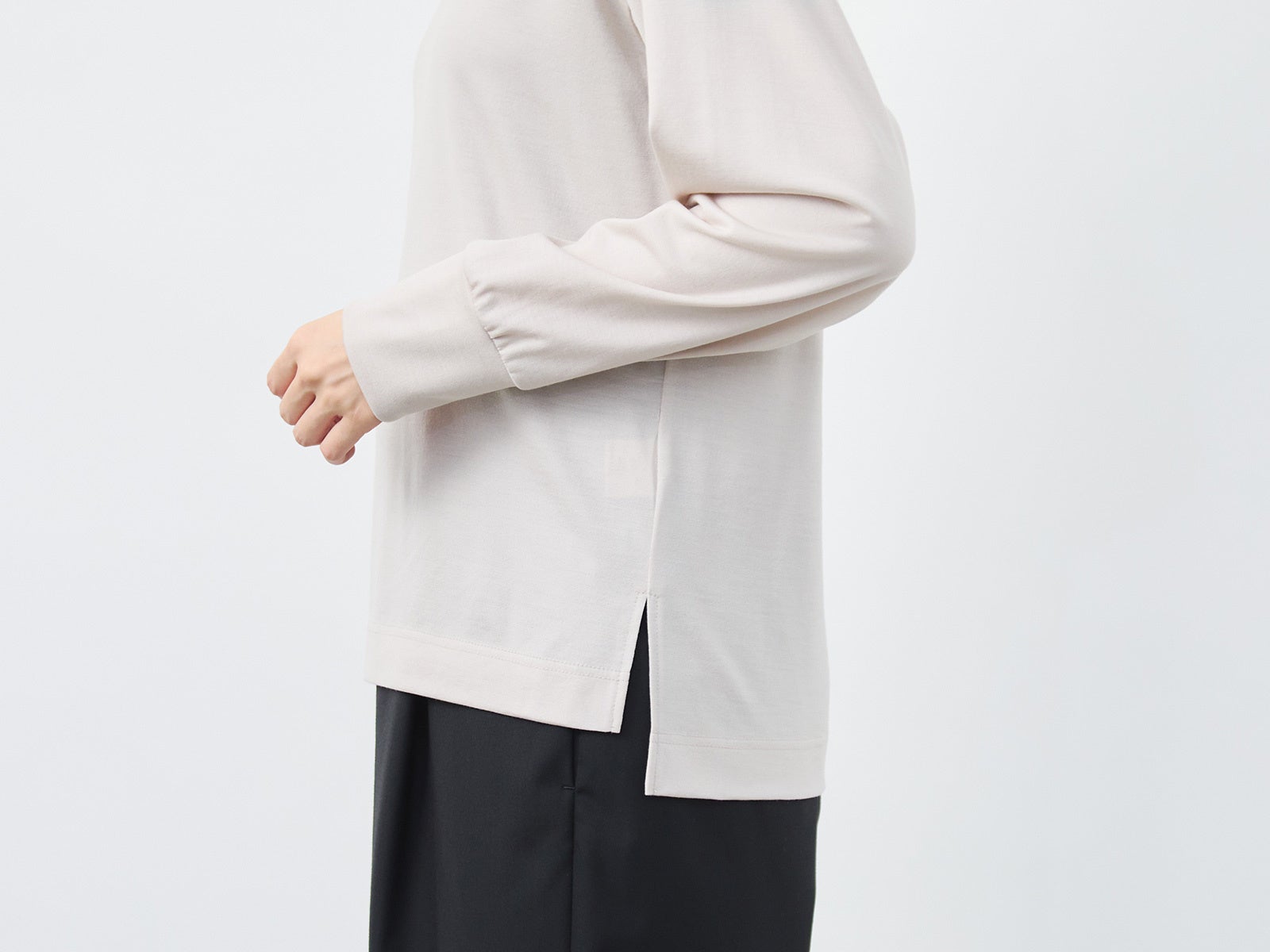 ゆとりのある腕まわりに対して、袖先のリブは少し長めに、手首にきちんと沿うフィット感にしています。