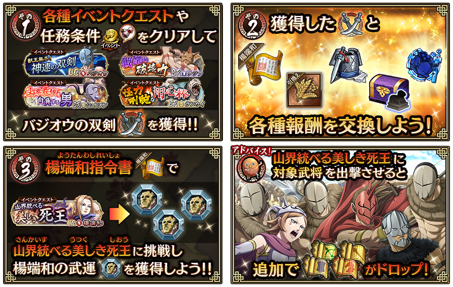 指定された武将でイベントクエスト『山界統べる美しき死王』をクリアすると、『騎兵の書 中級』『歩兵の書 中級』『盾兵の書 中級』『弓兵の書 中級』いずれかを追加で獲得できます!