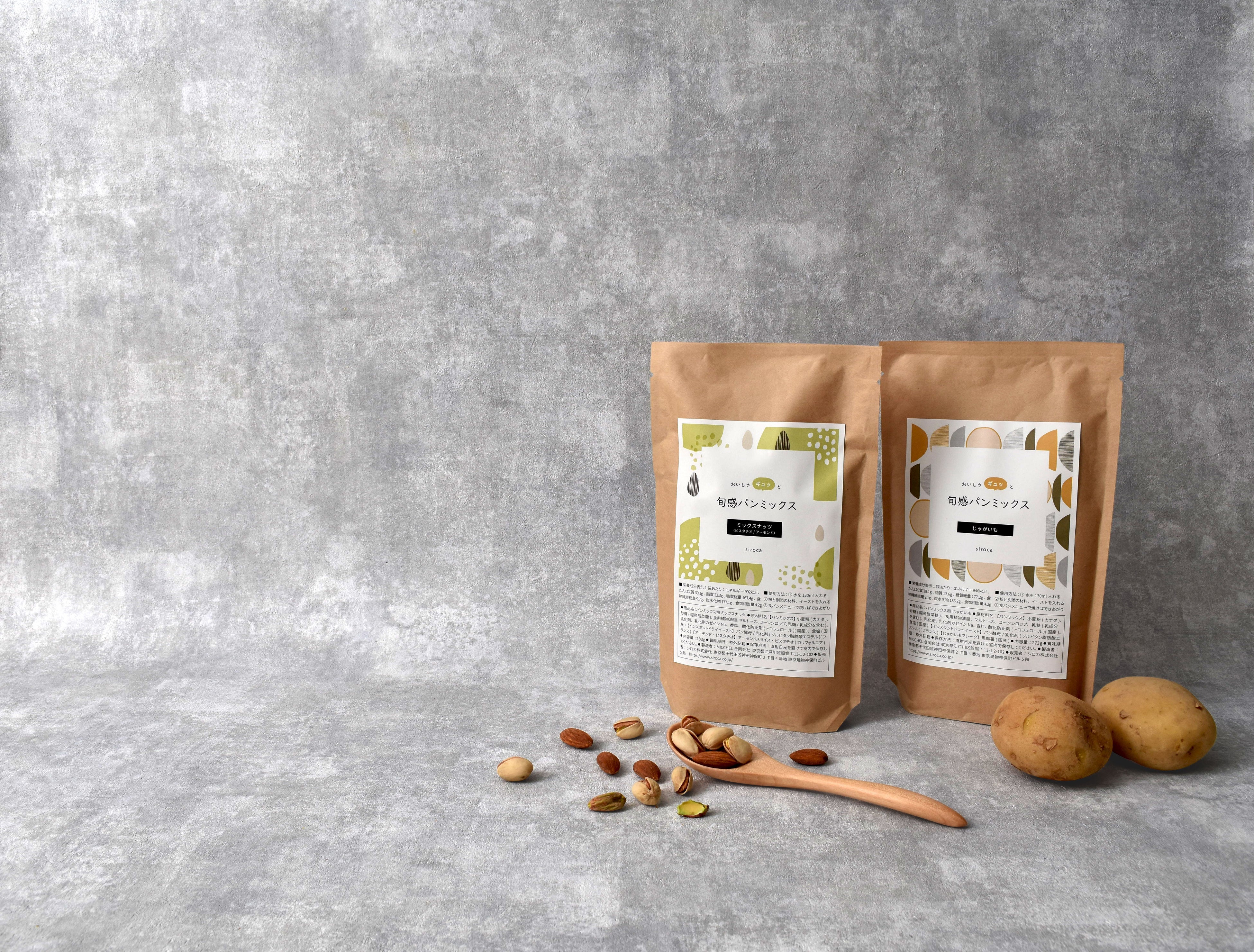 そんなシロカのパンミックスでより幅広いアレンジのパンを楽しんでいただきたいという想いのもと、新たなラインナップとして「おいしさギュッと 旬感パンミックス」を作りました。シロカのホームベーカリーに搭載の「食パン」メニューに対応したパンミックスに、旬の味を楽しめる具材を別添。用意するのは水だけで良く、手間なく食パンのアレンジを楽しめて、朝食にもおやつにも、さまざまなシーンで味わっていただきたい、新しいパンミックスシリーズです。今回は、じゃがいもフレークを使用したやさしい甘さの「じゃがいも」と、ナッツの食感と香りが楽しい「ミックスナッツ(ピスタチオ/アーモンド)」の2種類を、シロカオンラインストア 本店にて50個限定で発売。今後も、四季折々の旬の食材を使ったパンミックスをお届けしていく予定です。