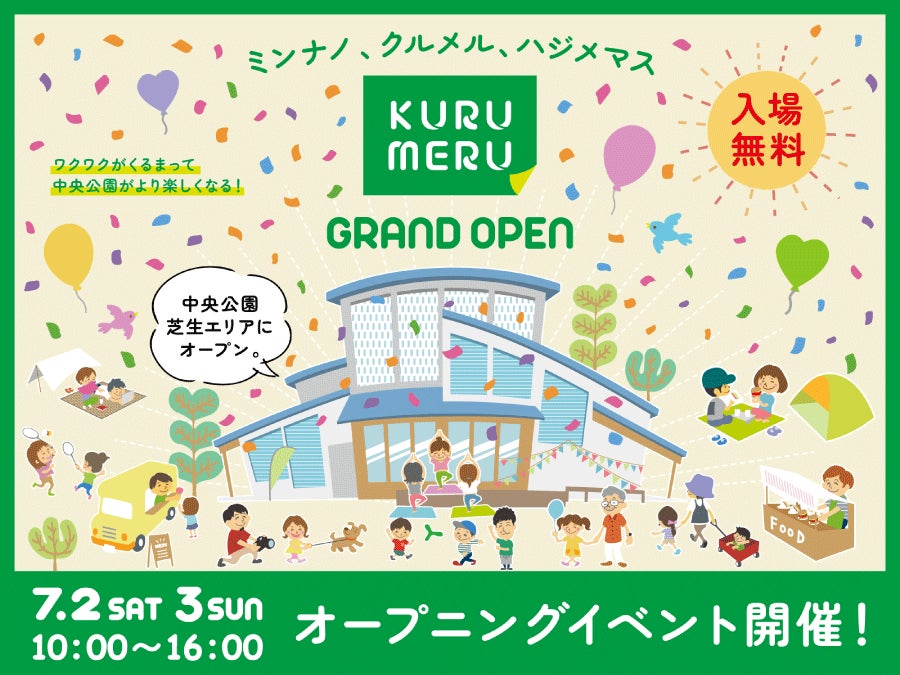 7月2日(土), 中央公園の芝生エリアにカフェやライフスタジオ等を有する新施設「KURUMERU(くるめる)」がグランドオープンします。